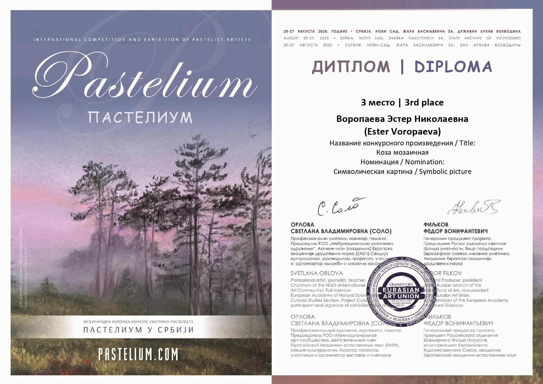 Моя картина «Коза мозаичная» заняла третье место на конкурсе пастелистов «Пастелиум» от Евразийского художественного союза в г. Нови-Сад, Сербия.